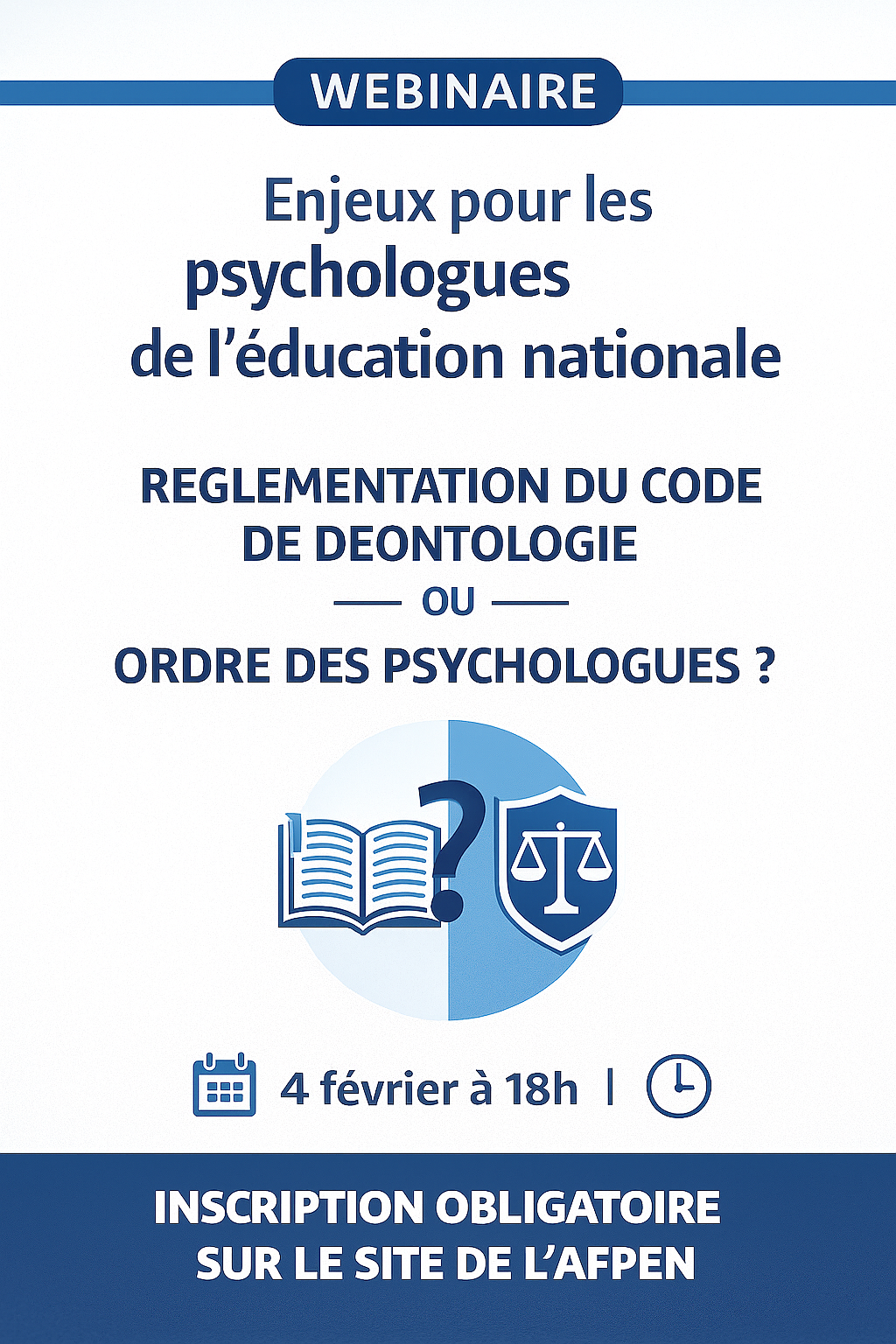 L’AFPEN vous invite le 4 février prochain à un webinaire consacré à un enjeu central pour notre profession : faut-il privilégier une réglementation du code de déontologie ou la création d’un ordre des psychologues ? À l’heure où les missions des psychologues de l’Éducation nationale évoluent et se complexifient, clarifier le cadre éthique et professionnel devient essentiel. Ce webinaire apportera des repères juridiques et déontologiques, éclairera les conséquences possibles de chaque option et permettra d’en mesurer les impacts concrets sur nos pratiques quotidiennes. Un rendez-vous incontournable pour comprendre les orientations en débat et participer à la réflexion collective.