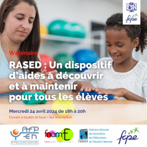 Nous avons le plaisir de vous inviter à notre webinaire « RASED : un dispositif d’aides à découvrir et à maintenir pour tous les élèves » qui aura lieu le mercredi 24 avril 2024 de 18h à 20h.